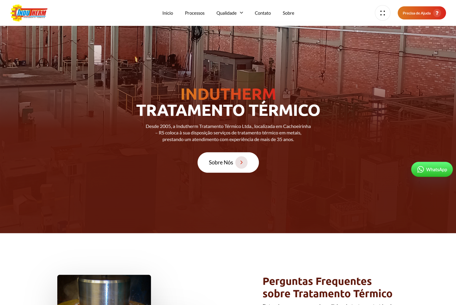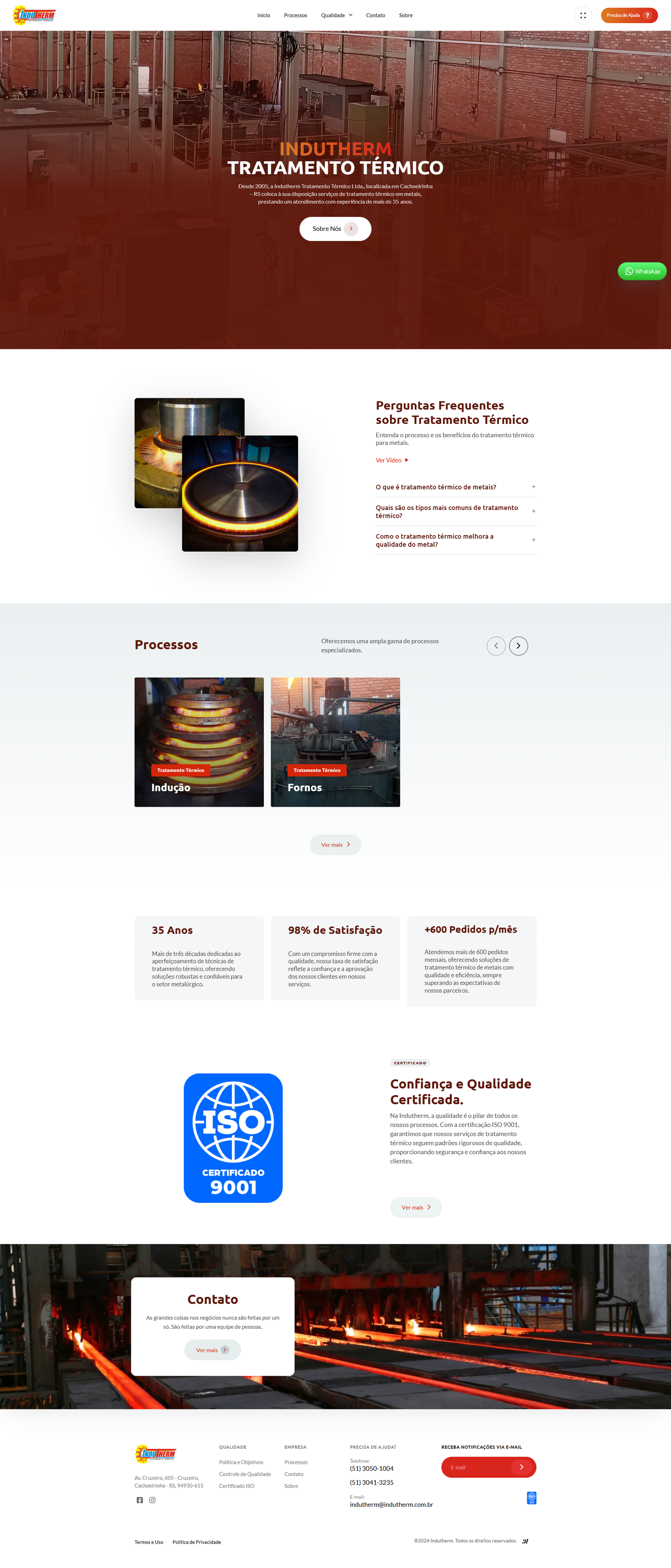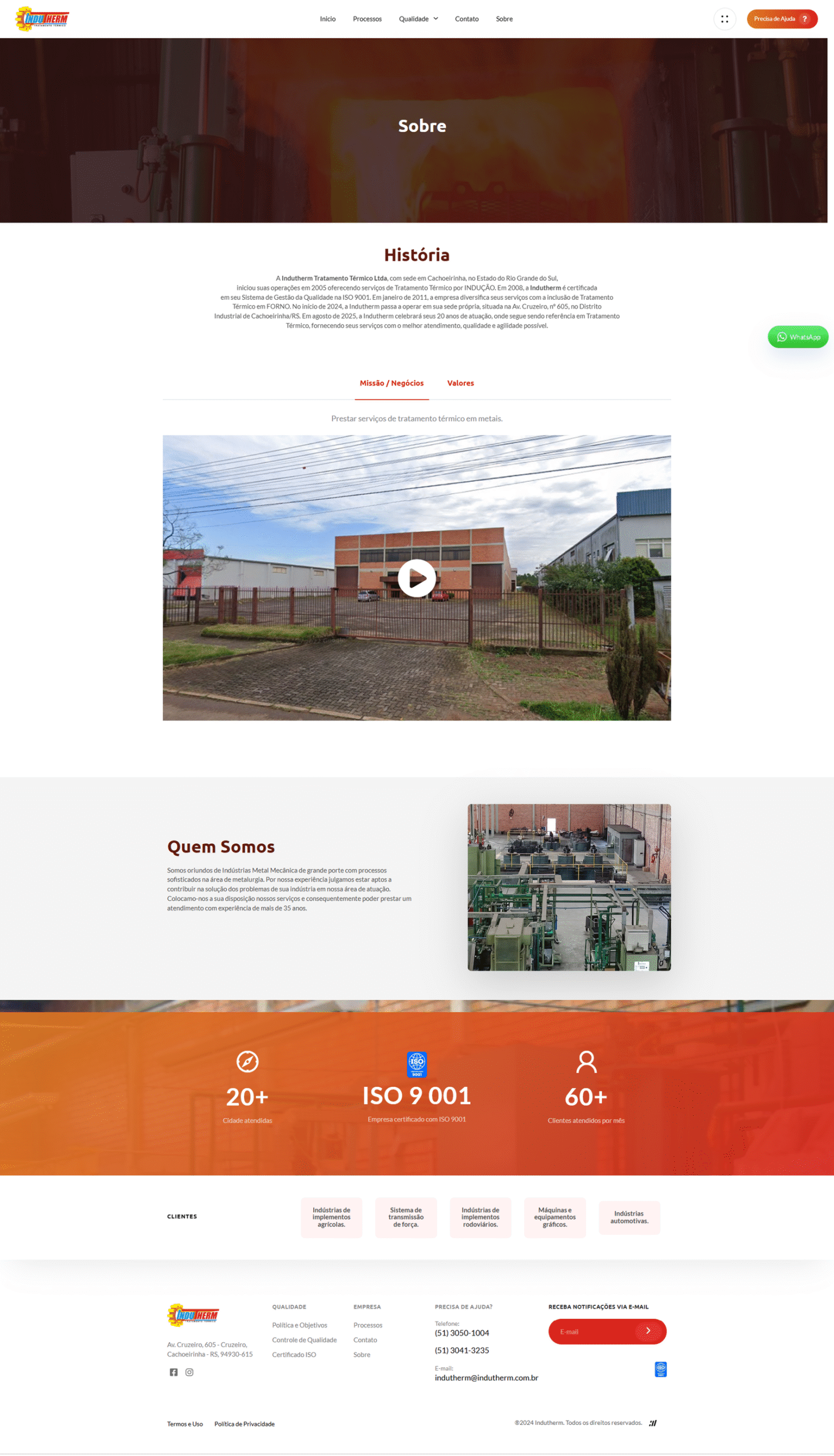 O projeto consistiu no desenvolvimento de um site institucional robusto e moderno, alinhado com a proposta da Indutherm de ser referência em tecnologia e eficiência térmica. O foco foi criar uma plataforma que apresentasse detalhadamente suas soluções industriais, transmitisse credibilidade e facilitasse o contato direto com clientes e parceiros.